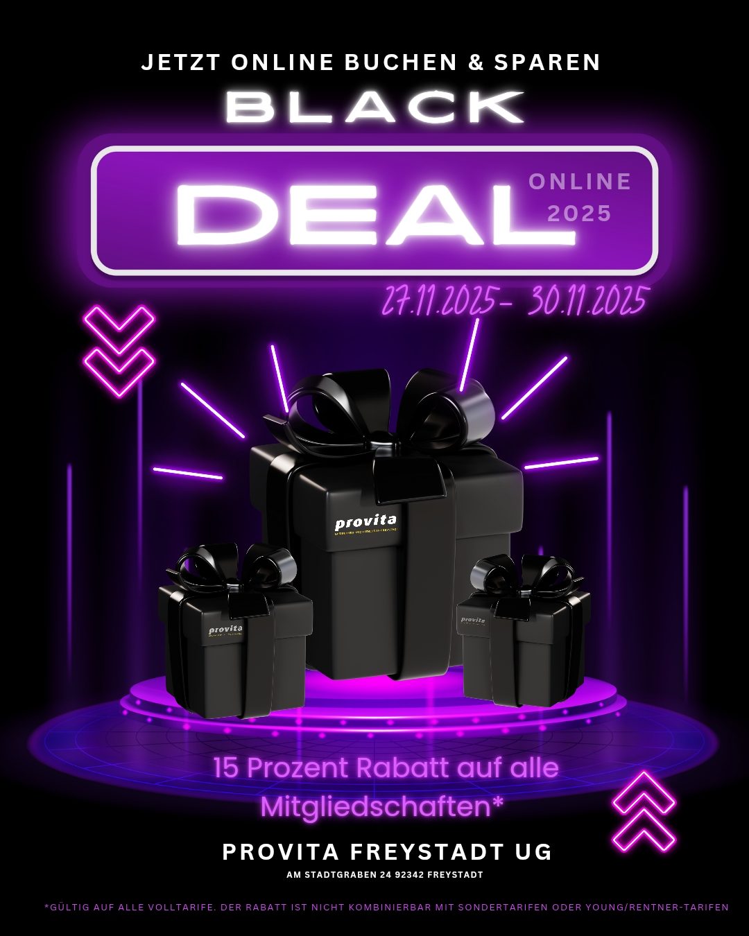 * gültig für Neukunden ohne aktuelle Mitgliedschaft, ab 18 Jahre. Nur als Online-Abschluss im Zeitraum 26.11. bis 30.11.2025 verfügbar. Gültig für alle Volltarife. Nicht kombinierbar mit Sondertarifen, Young- und Rentnerrabatten, anderen Rabatten und Aktionen. Die Aktion ist limitiert auf 50 Personen und Online-Abschlüsse. Die Provita Freystadt UG behält sich demnach vor, die Aktion früher zu beenden, oder auch zu verändern. Es besteht kein Anspruch auf Gewähr.
